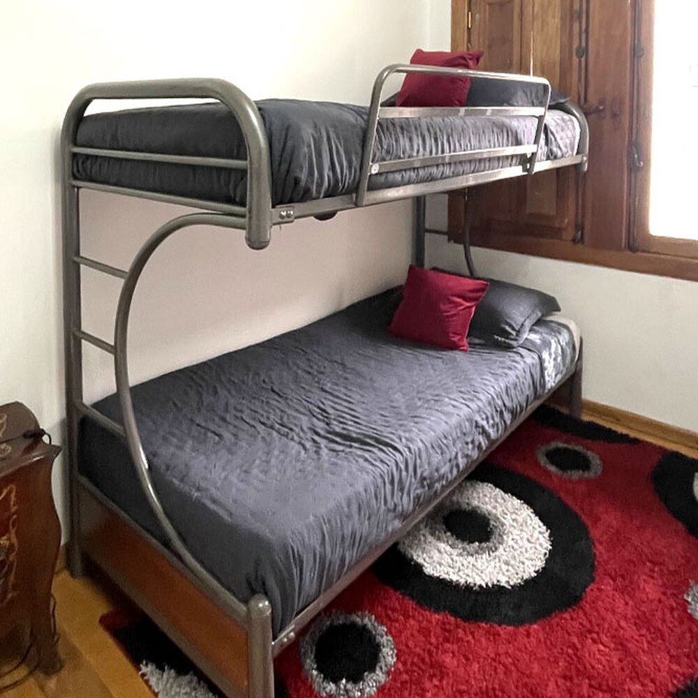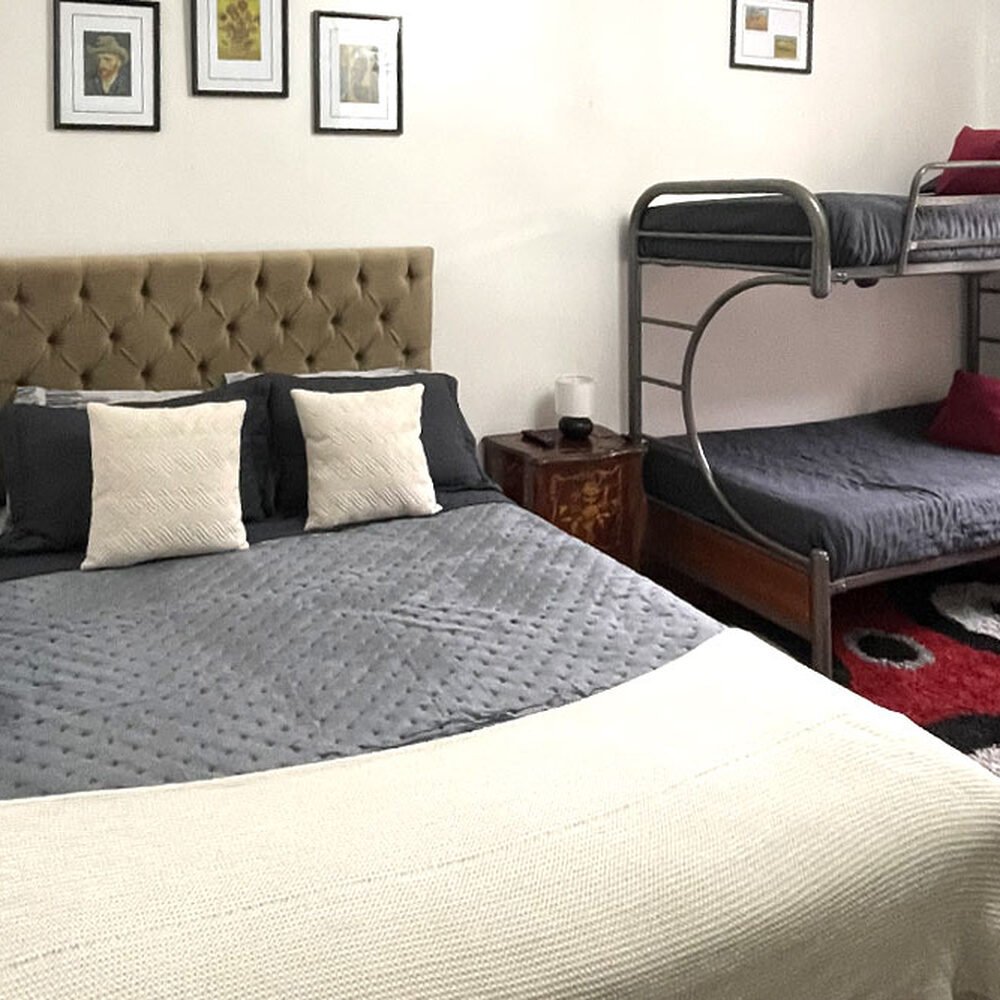 La Habitación para 4 personas en Hostal Casa Torino es ideal para grupos o familias que buscan un hospedaje cómodo y conveniente en Santiago. Esta amplia habitación ofrece una cama de dos plazas y una litera con dos camas y calefacción para una estancia placentera, también cuenta con estacionamiento gratuito previo confirmación. Encuentra el refugio perfecto para descansar y explorar desde Providencia.